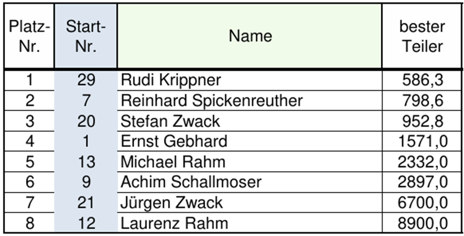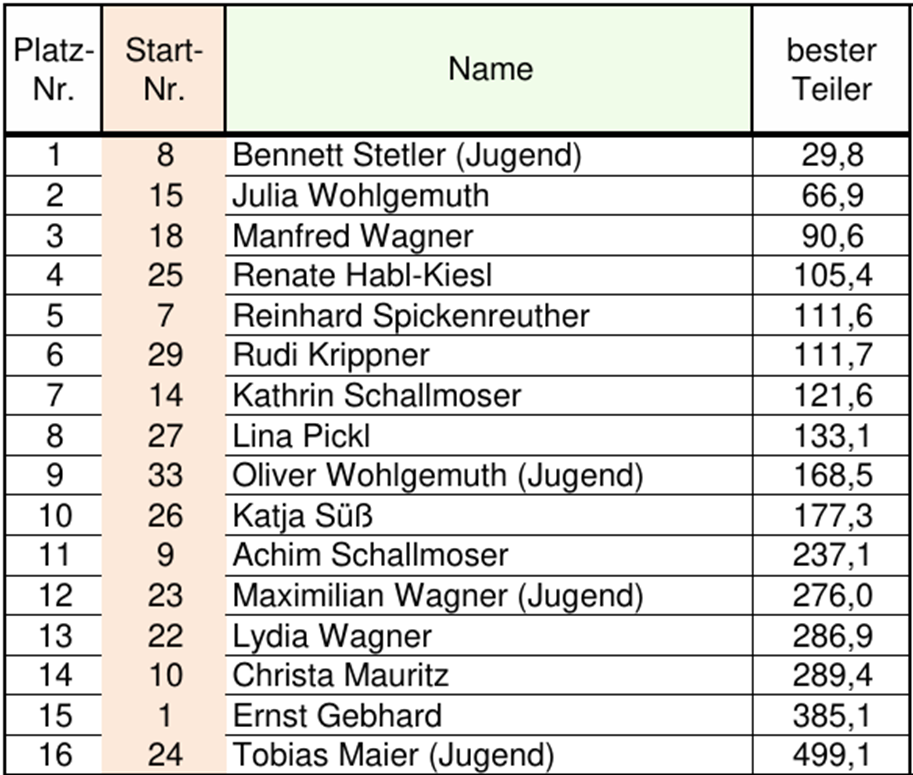 Hier noch ein paar Eckdaten, bevor wir zu den Siegern kommen. 38 Teilnehmer mit 52 Starts, in mehreren Disziplinen, sind ins Rennen gegangen. Um die Chance für das Siegerpodest zu erhöhen, wurde kräftig nachgekauft.