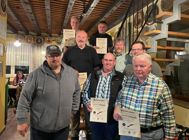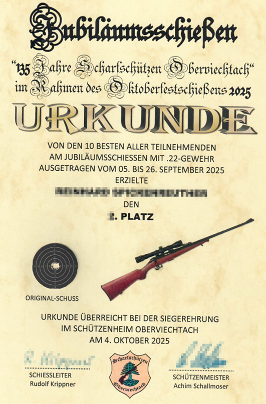 Die zehn Erstplatzierten in der Einzelwertung des Oktoberfestschießens erhielten daher neben einem Sachpreis zusätzlich auch eine eigens anlässlich unseres 135-jährigen Vereinsjubiläums kreierte Urkunde überreicht.